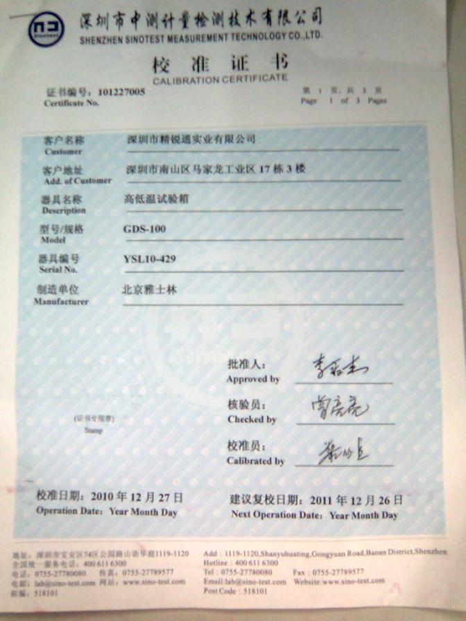 >>高低溫濕熱試驗箱校準證書-深圳中測計量-深圳精銳通