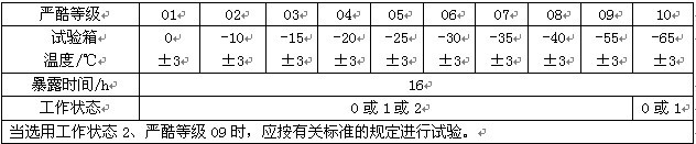 恒溫恒濕試驗箱試樣在恒應力狀態暴露期間,溫度變化應十分緩慢以防止試樣損壞。用條件試驗方法11或12時,溫度變化階段應保持最大的相對濕度,并在有關標準中說明試樣上是否允許出現凝露。恒溫恒濕試驗箱適用于航空航天產品、信息電子儀器儀表、材料、電工、電子產品、各種電子元氣件在高低溫或濕熱環境下、檢驗其各性能項指標。 條件試驗10方法:低溫(下圖為條件試驗方法10低溫的嚴酷等級表)