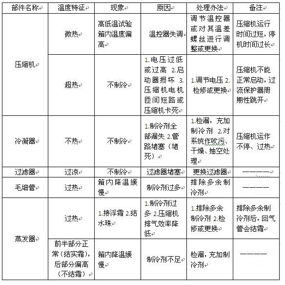 眾所周知,溫度是表示物體的冷熱程度的物理量,是制冷工程的一個重要的技術(shù)參數(shù)。高低溫試驗(yàn)箱的主要部件是:壓縮機(jī)、冷凝器、過濾器、毛細(xì)管、蒸發(fā)器等,也就是說,他們的工作溫度特征反映了整個制冷系統(tǒng)的運(yùn)行狀況。我們在判斷高低溫試驗(yàn)箱是否存在故障時,最行之有效的方法就是用手去摸各部件的表面溫度。然而,他們的溫度特征怎樣才算正常,請看下表。