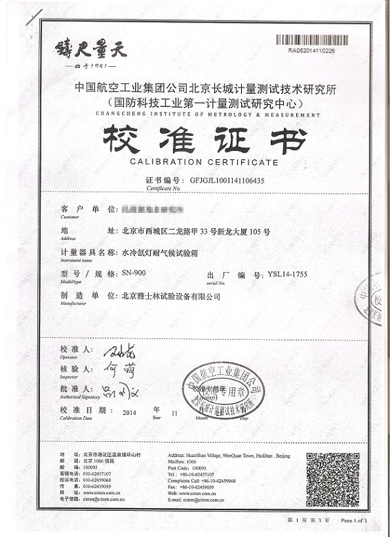 ·氙燈老化試驗箱校準證書模板下載—北京長城計量所