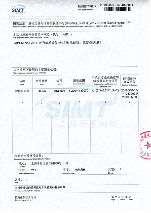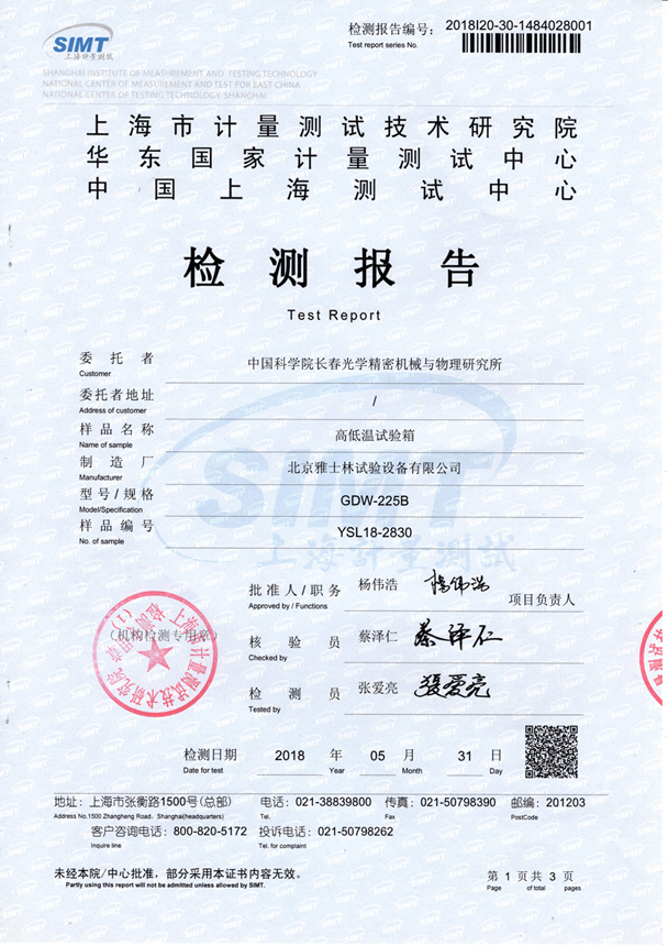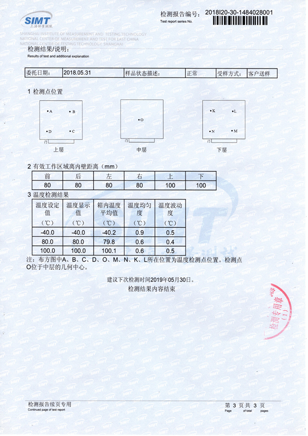 高低溫試驗(yàn)箱在首次投入使用前,應(yīng)對可反映設(shè)備性能的相關(guān)參數(shù)進(jìn)行詳細(xì)確認(rèn)及測試,在日常使用中則應(yīng)依據(jù)所使用的試驗(yàn)方法進(jìn)行對試驗(yàn)參數(shù)的要求,需確認(rèn)其性能是否滿足試驗(yàn)參數(shù)的要求。更多的用戶會選擇由第三方檢測機(jī)構(gòu)進(jìn)行檢測,并出廠檢測報(bào)告,如下: